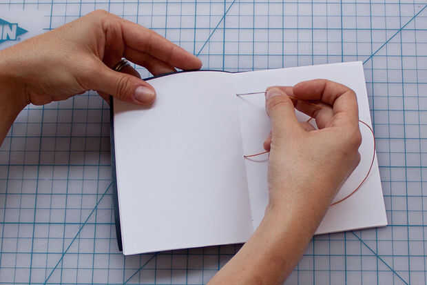 Tomar la aguja en el orificio superior, tirando firmemente pero sin tirar el hilo extra a través de.