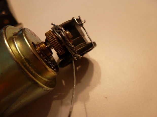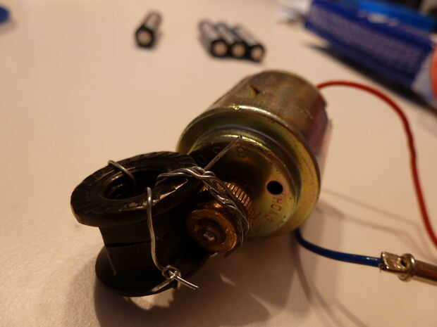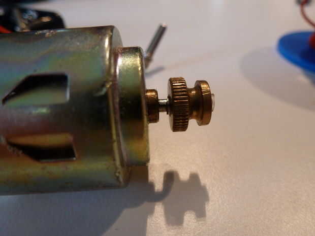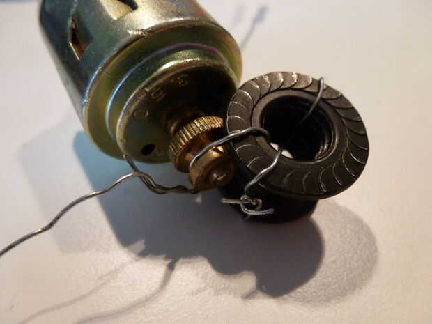 Ahora tome su tuerca, su motor y un pedazo largo de tieso alambre y coloque la tuerca en el eje del motor como tal: