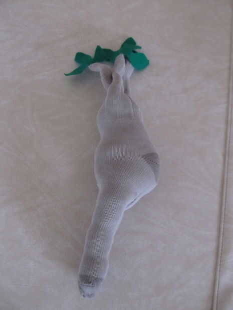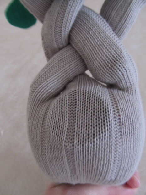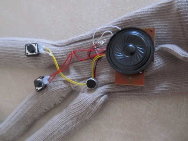 Luego tomar el módulo de los sonidos y determinar qué botón es registro a juego. (en la mía roja fue récord, amarillo del juego) Coloque el módulo dentro de la cabeza para que el orador enfrenta a la parte parte posterior o talón del calcetín. Tenga cuidado de no separar cableado al hacerlo. Maniobra de los botones que van ligeramente la base de las ramas. Coloqué el botón de reproducción en una rama externa y el registro en la rama media que fácilmente podía recuerdo que fue lo que. Ahora llene una cantidad de Softbol tamaño de relleno frente el módulo para formar la cabeza y mantenerla en su lugar.