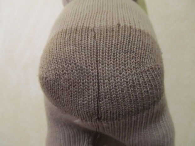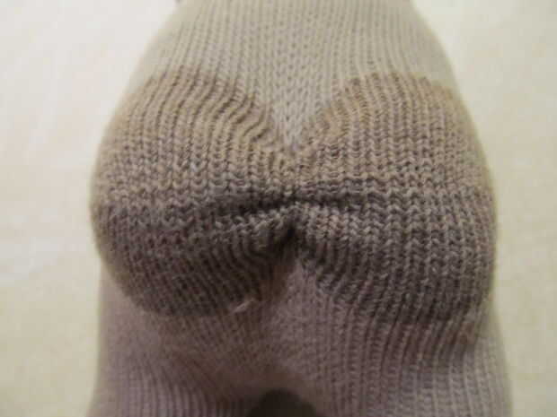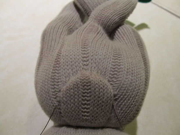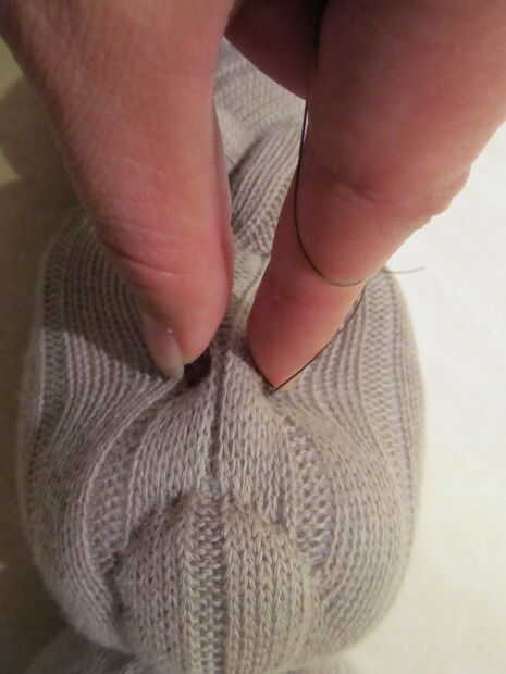 Para las nalgas poco lindas, asegure el extremo de su hilo de rosca en la parte inferior central del tacón. Llevar la aguja y el hilo a la parte superior central del tacón. Buceo la aguja bajo el relleno a su extremo asegurado. Tire firmemente y repetir este proceso unas 3 veces y asegure el extremo.