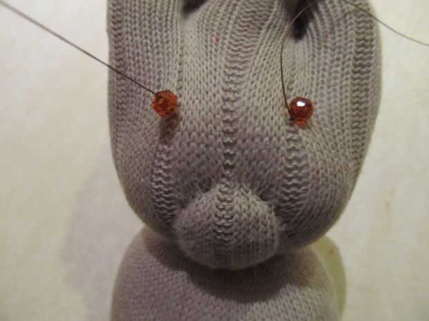 Para los ojos necesita sus 2 granos de color ámbar. Espaciamiento más los ojos aparte y luego quieres que, asegure el extremo del hilo y añadir 1 grano en la misma. Buceo la aguja bajo el relleno y subir en la ubicación del segundo ojo. Ahora pase el segundo talón en. Pellizcar el puente de la nariz y junte firmemente los ojos. Pasar la aguja hacia atrás y hacia adelante varias veces de esta manera y luego fijar su final.