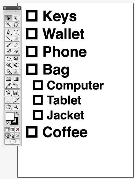 Entonces utilicé Adobe Illustrator a la carne hacia fuera el tamaño de las etiquetas engomadas (sólo un poco menos de la mitad de la anchura del espejo era lo que quería), para escoger la fuente quería, para el diseño de las plazas (usado Wingdings y añadido un contorno para espesar las cajas) y organizar la lista visualmente.