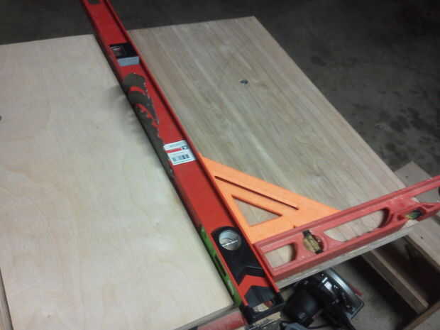 Lo primero que tienes que hacer es asegurarse de que los bordes en la tabla nueva son perpendiculares a la hoja. Lo hice poniendo un nivel contra el disco (tenga cuidado de no presionar contra la hoja), entonces una escuadra y un nivel para mantener los bordes cuadrados a la hoja. Esto también Asegúrese de que los bordes de la tabla son siempre la misma longitud alejados uno del otro, aunque con este diseño no es tan importante. Una vez que tenga los bordes cuadrados Obtén la longitud de la mesa (desde el frente hacia atrás). Mina fue 26 1/2 pulgadas.