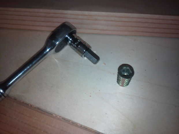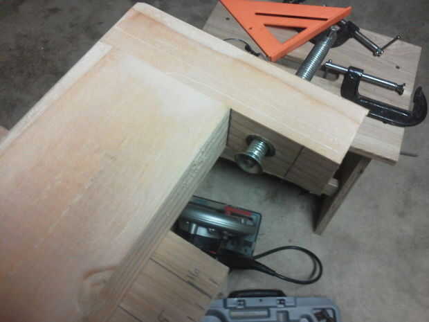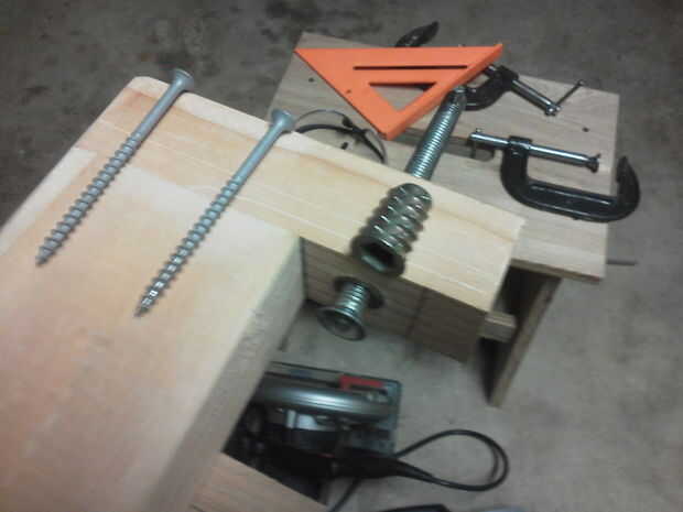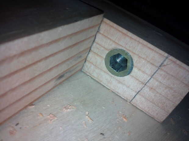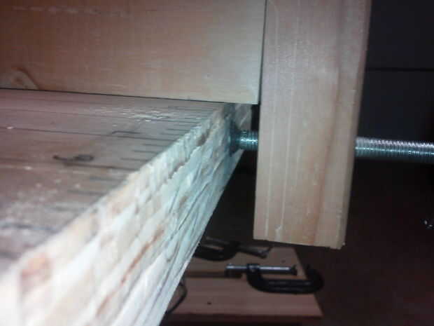 Tomé estas tuercas de tornillo-en de un viejo pedazo de los muebles, pero se puede comprar en cualquier ferretería. La prensa en unos funciona bien también, pero requieren una gran broca demasiado hacerlo al ras. También tuve que romper un C-clamp para este montaje de la varilla roscada, que es triste, pero no puede hacer una tortilla... También se hace este montaje una varilla roscada, plana perilla y pasador de acero (requiere taladrar un orificio en la varilla roscada, que es complicado). Ahora perforar un agujero de 1/2 pulgada en el frente 2 x 2 y atornillar la tuerca del tornillo con una llave hexagonal grande. A continuación poner el montaje de la varilla roscada en la tuerca, el tornillo en la parte frontal 2 x 2 con dos tornillos y listo!! Marqué de la mesa con resoluciones en lápiz, que parece muy temporal, pero lucharé eso Batalla más adelante.