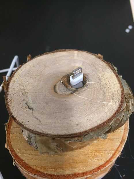 Después de todo el producto seco y pegado juntos, corrí el cargador a través del orificio. Lo trajo hacia fuera más lejos de necesarias de modo que yo podía caliente pegamento final del cargador y un poco por el cable. Después se aplica el pegamento, bajé el cable en el agujero dejando suficiente espacio para el cargador empujar hacia fuera la parte superior.