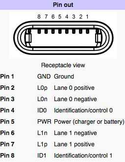 Cable aclarar que usé es una actualización a su anterior modelo de carga. El modelo anterior era más abultado y tenía 30 pernos (los rectángulos metálicos que puedes ver en la punta del cargador). El nuevo modelo es delgado y consta de 8 pernos. cada pin tiene un cierto trabajo para completar, como se ve en la imagen. El modelo anterior puede ser insertado también solamente "derecho para arriba" mientras que ahora, el cargador puede ir en el dispositivo ya sea cierto y aún siendo capaz de cargarla. El cable aclarar todavía tiene el USB final que puede acoplarse a la mayoría de los ordenadores portátiles y adaptadores de corriente.
