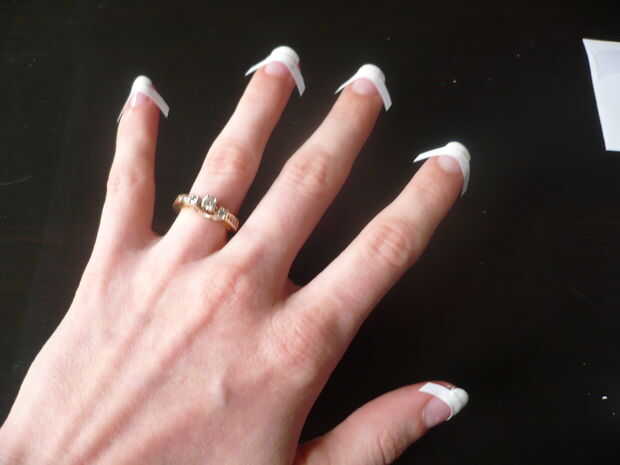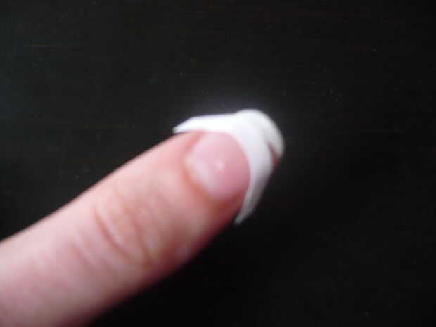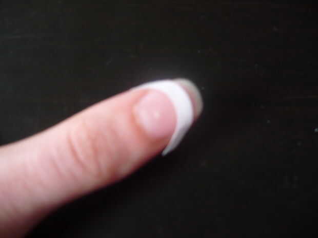 Uno a la vez, aplicar una guía para cada dedo, justo debajo de donde la uña se va del blanco al natural. Asegúrese de que usted presione hacia abajo firmemente ya que no queremos que el color de la punta en el resto de la uña. Puede ser más fácil hacer una mano a la vez.