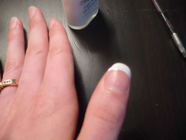 Usando el color A, pase de un lado de la uña a la otra en un trazo continuo, cubriendo solo la punta de la uña. Repita para cada uña y dejar secar totalmente.