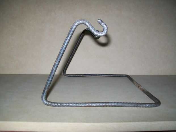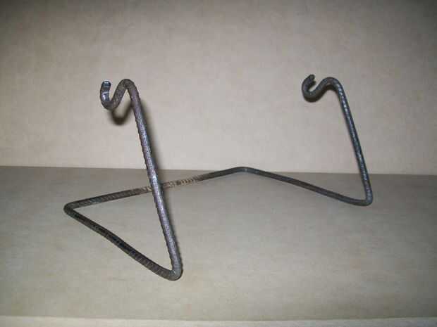 Para hacer el soporte, con la ayuda de mi mordaza doblar la varilla sin cortar, a la forma que se muestra en las fotos. Para hacer los ganchos, empezar pegando la punta de la caña poco a poco, liberando la barra en Resumen pasos, agarrando en el tornillo de banco y golpear otra vez... Este paso es de paciencia pero se logra hacerlo estoy seguro. Para lograr un soporte que no sean temblorosos, que golpee la parte base del soporte para doblar un poco, por lo que estarían más como en 4 puntos en lugar de plana, como se muestra en las fotos.