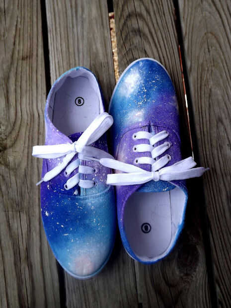 objetivo: hacer zapatos de galaxia que molan y son para cualquier edadmateriales-periódico-zapatos negro-esponjas-Brochas de pintura, pincel de punta fina-placas de papel-cepillo de dientes-cinta-pintura-negro, azul marino, púrpura, rojo, blanco, ros
