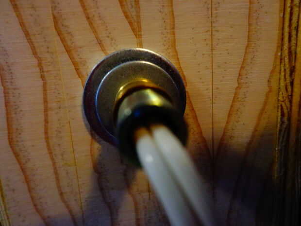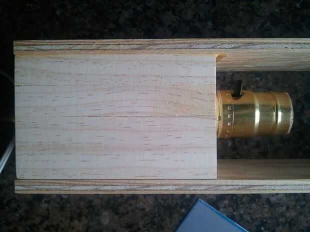 Cortan pedazos de madera. Cada uno fueron. 75 "x 3.5" x 4.75 ". Pegué estos juntos. Recuerde a la abrazadera. Luego perforé un agujero en la parte superior de la madera todo el camino con broca de 1/2. Esto es para colocar el eje de la toma de luz. Entonces trajo el cable a través de con la tuerca y el perno ya en el alambre. Después sujeté la toma para el cable y eso es todo.