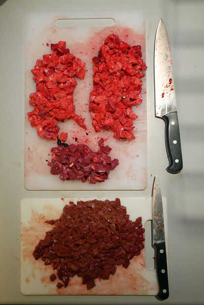 De todos modos, cortarlas en trozos pequeños. Retire cualquier trozos grandes de grasa dura alrededor del corazón.