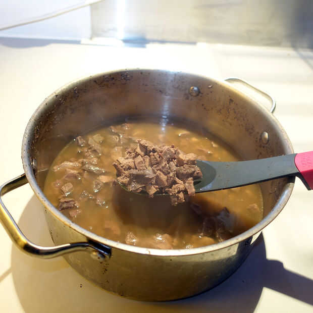 Poner el desplume en rodajas en una olla grande de agua fría. No te preocupes el pulmón flotando a la superficie, los trozos deben ser lo suficientemente pequeños como para que todavía te cocine bien.