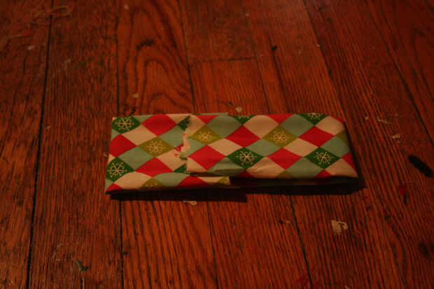 Ahora, vas a agarrar a la tela y doblar sobre un rectángulo más pequeño, luego pegamento caliente los bordes juntos en su lugar.