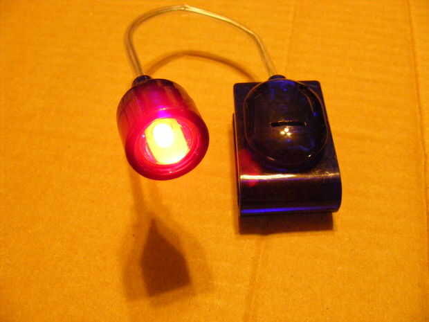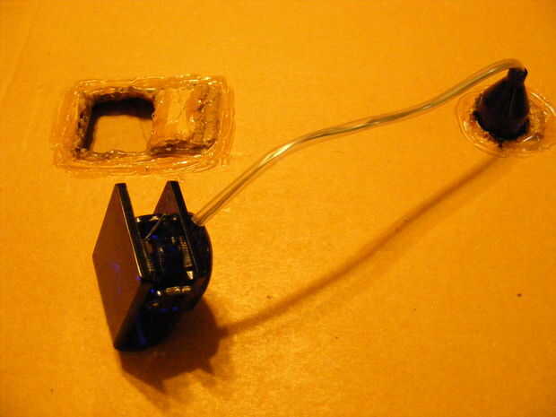El 5060Fuente de luz tenía un clip de resorte en el otro extremo. El paquete de baterías y el interruptor se montaron en un lado del clip. Yo quería ser capaz de encender esto fácilmente así que corte un agujero para el interruptor de batería pack en la parte delantera del tablón de anuncios. Si las baterías deben cambiar, sólo pude tire de la unidad de la parte de atrás y cambiar las pilas.