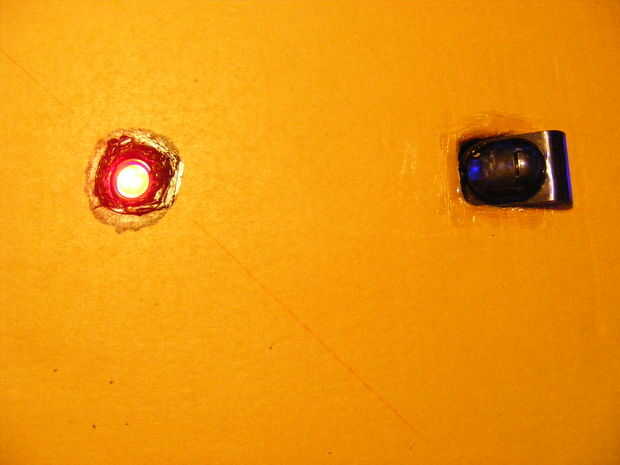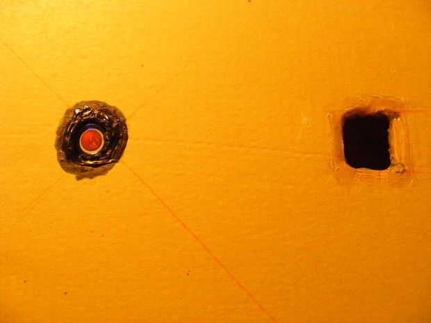 Encuentre el punto de centro donde desea montar el LED. Perforar un agujero en el cartón para que la linterna de LED se puede montar. Cubrí los bordes del agujero con pegamento caliente. Básicamente hizo un ojal reforzado la bodega y siempre cabe una fricción para mantener el proyector en posición.