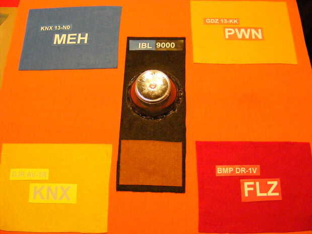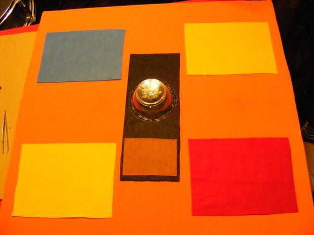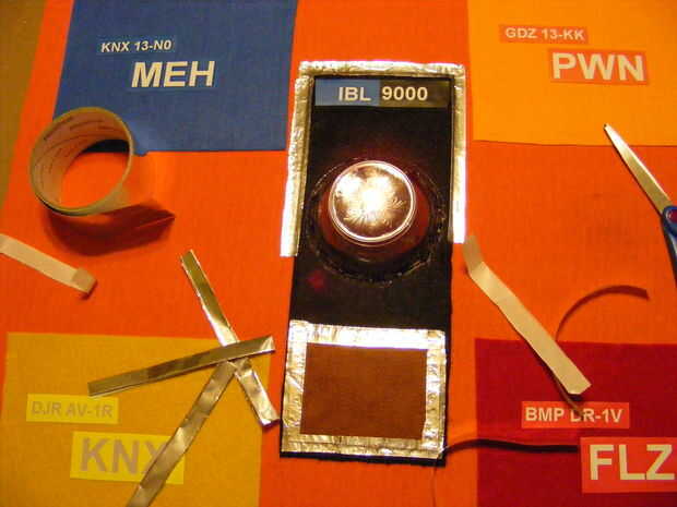 Con su programa de gráficos favorito, cree el logotipo y cualquier texto que desee en las pantallas de visualización. Corte y caliente pegamento en su lugar. Sólo usé Mspaint para hacer un rectángulo de color llenado con texto blanco. Puedes mejor emparejar el color con el tejido o crear hierro-en los gráficos de los paneles de la pantalla.