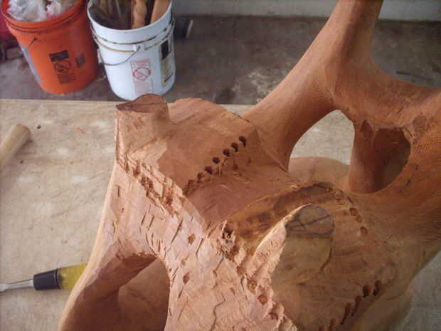 En este momento en la talla, extremo cuidado se considera en la extracción de madera hasta que todos los elementos de diseño: Halcón, halcones de bebé, el nido, la madre la montaña están en unision uno con el otro. Es como la visión sobre cómo un arroyo apacible río fluye sobre piedras pulidas... piropos uno al otro.