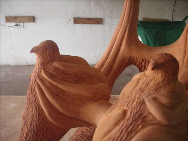 Los halcones de la montaña y el bebé fueron dados una textura diferente con una gubia para representar una mayor conciencia de la madre... La madre naturaleza.