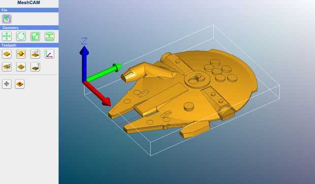 La primera cosa a hacer es cargar el fichero .stl del Halcón Milenario desde el último paso. Las unidades del archivo están en mm. elige la opción de fresado de 3 ejes.