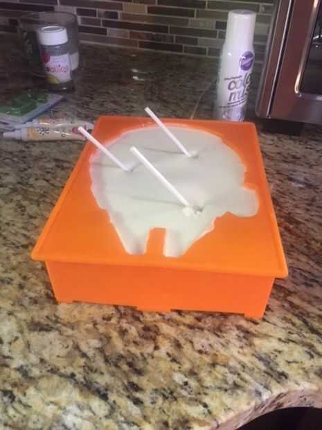 He añadido las 4 onzas de caramelo retenido los agujeros que cuando empujé los palillos después el molde endurecido como se aprecia en las fotos. ¿Pero probablemente no es necesario, pensé que necesitaba en el momento?