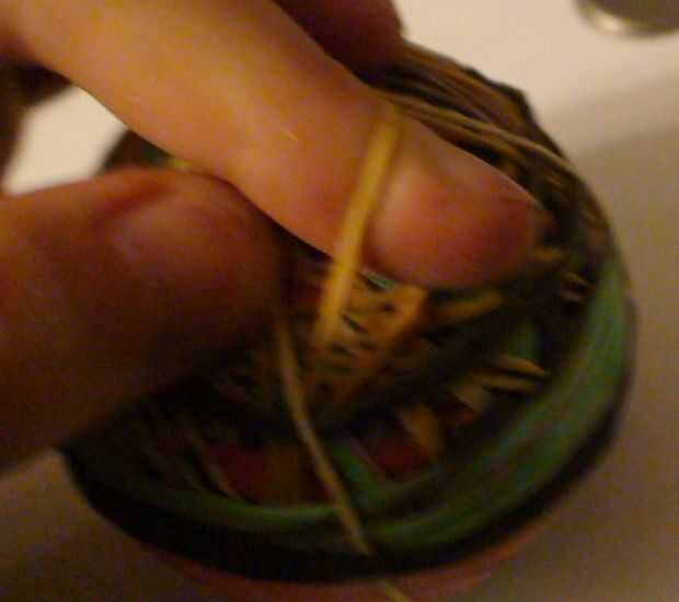 Aproximadamente hasta la mitad del lado de la pelota, agarre una de las bandas de caucho incrustadas y tire lo lejos está bebiendo a amigos. Forme un bucle con esta banda y deslice el lazo a través del centro del disco restante. Encontrar que la orientación en la imagen es mejor que el disco va a seguir mejor la curva de la bola.