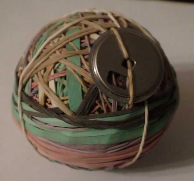 Hacer una bola de goma si bastante directa. Tomar una cantidad bastante grande de bandas de goma. Comienzo con algunos agrupados para arriba en el centro y fijar con una venda envuelta alrededor varias veces. Continúe envolviendo el nuevas bandas alrededor en un patrón uniforme hasta tener una bola de tamaño suficiente.
