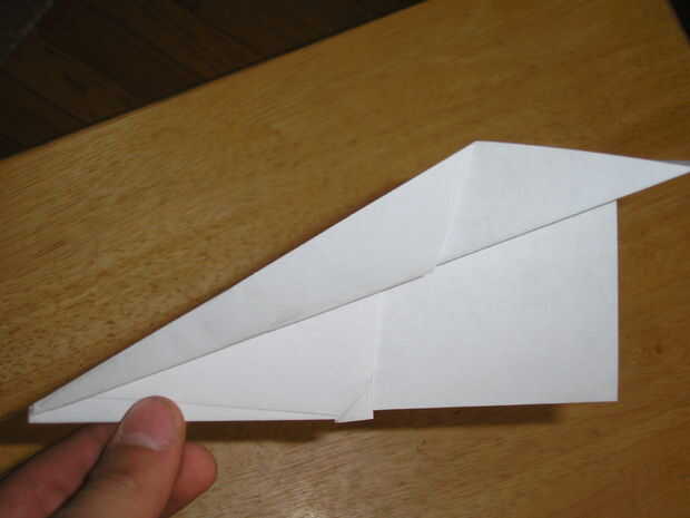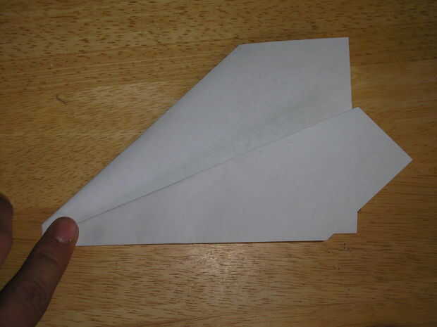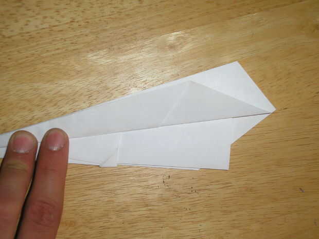 Ahora voltee todo el asunto y doblar por la mitad así que tienen una especie de cuadrilátero de forma triangular. Ahora doblar el borde superior hasta cumplir con el borde de la parte inferior. Doblar el otro lado igual y desdoblar para hacer alas. Estos deben ser noventa grados al cuerpo del avión. Generalmente pongo alas de tipo estabilizador en la mía pero esto no es necesario a menos que el avión no Vuele recto. En la mía, esto también es sólo para las miradas, no pongo otra cosa. Para hacer este doble la parte inferior de las alas para cubrir la parte superior del plano. Hacer lo mismo al otro lado y desdoblar para que se vea como la imagen.