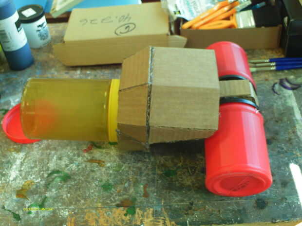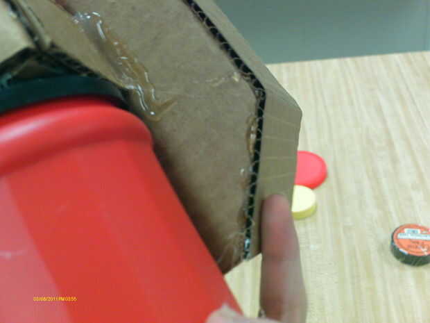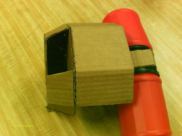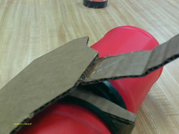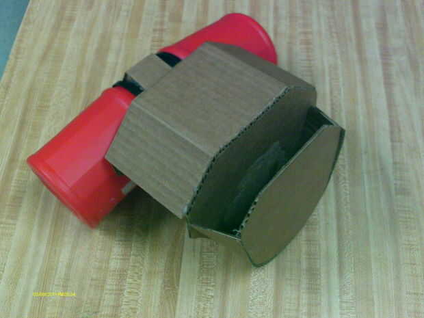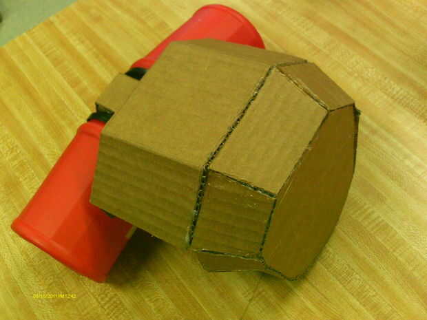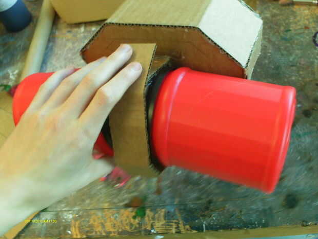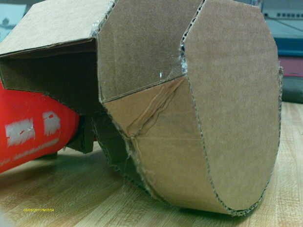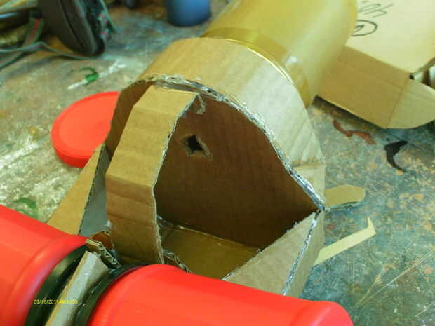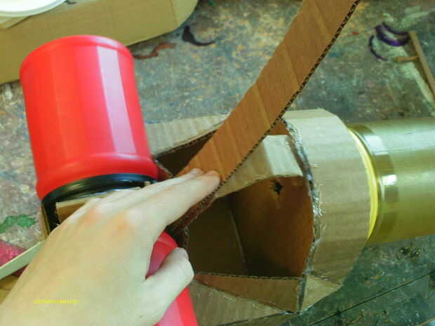 Basically, I started by setting my two containers for my cylinders at an angle. Adición de cartón, hizo el perfil de varios puntos claves en el reactor. A continuación, fleshed hacia fuera los lados con más cartón y caliente pegamento. He utilizado un montón de triángulos ya que son fáciles de cortar y puede fácilmente encajan para formar las formas complejas. Una vez que la mayoría de los reactores construidos, había derretido un agujero en la tapa de mi cámara de vacío para mi centro de LED y hace un agujero correspondiente en la parte frontal del reactor. Alinear los dos orificios, pegué mi tapa. No incluya la pistola aunque como usted necesitará poder instalar su cableado en él más tarde.