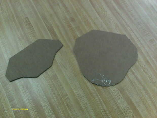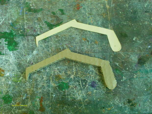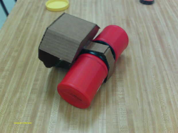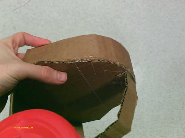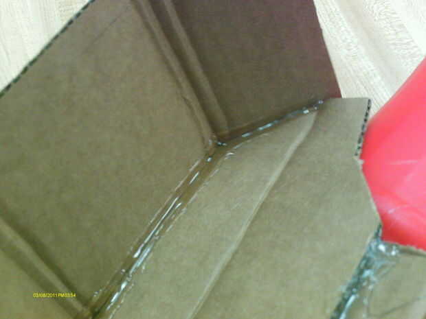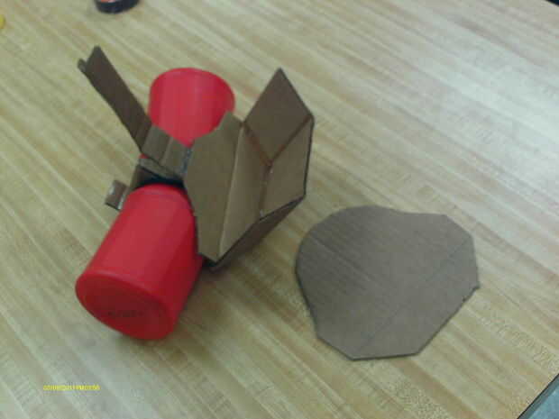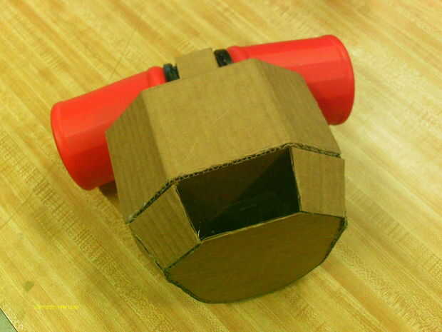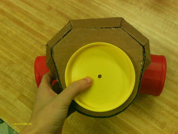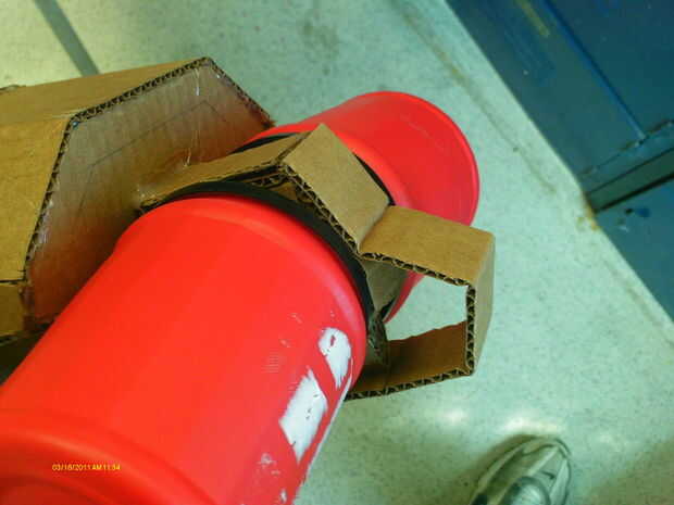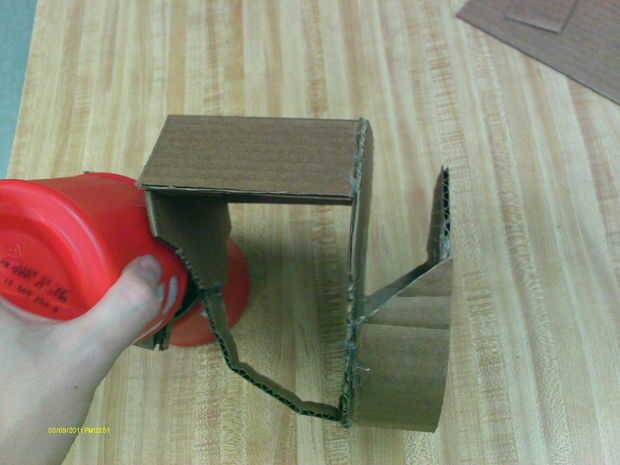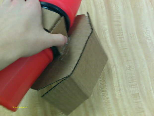 Basically, I started by setting my two containers for my cylinders at an angle. Adición de cartón, hizo el perfil de varios puntos claves en el reactor. A continuación, fleshed hacia fuera los lados con más cartón y caliente pegamento. He utilizado un montón de triángulos ya que son fáciles de cortar y puede fácilmente encajan para formar las formas complejas. Una vez que la mayoría de los reactores construidos, había derretido un agujero en la tapa de mi cámara de vacío para mi centro de LED y hace un agujero correspondiente en la parte frontal del reactor. Alinear los dos orificios, pegué mi tapa. No incluya la pistola aunque como usted necesitará poder instalar su cableado en él más tarde.