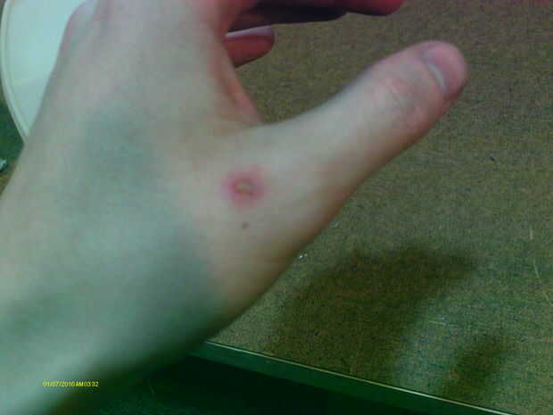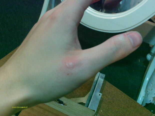 Echa un vistazo a mi mano. Yo no estaba prestando atención a donde mi mano izquierda fue cuando apenas había hecho una tachuela de pegamento, y mi cable se movió lejos del sitio de Unión. Rápidamente ponga mi pistola de pegamento y trató de corregir el cable. Lo siguiente que sentí fue abrasador dolor de la parte trasera de mi mano. Que había tocando mi boquilla de pistola de pegamento de 40 vatios durante aproximadamente 2 segundos. Mantener un ojo en la mano mientras observa a través de mis fotos, como se transgreden durante días para mostrar lo que convierte a una quemadura pequeña en.