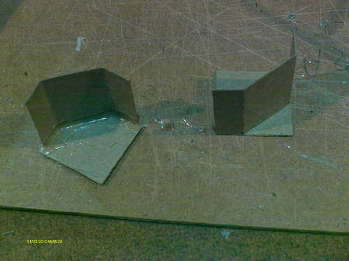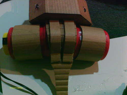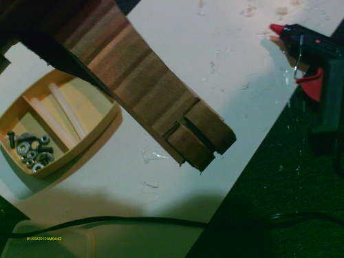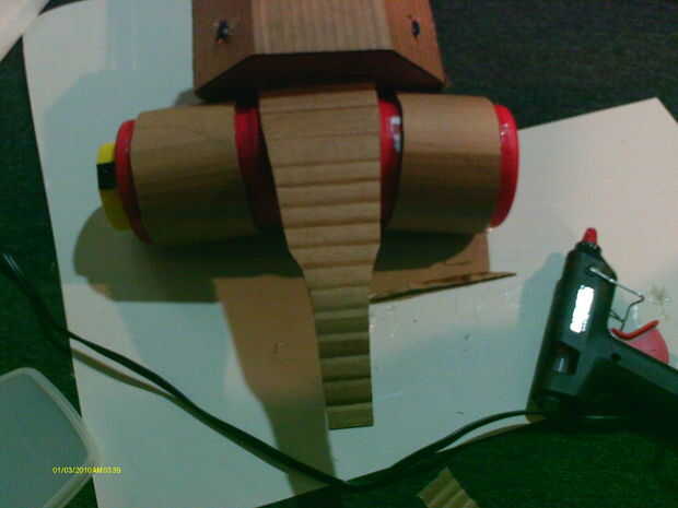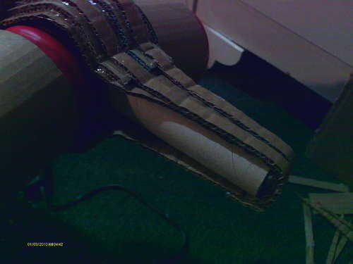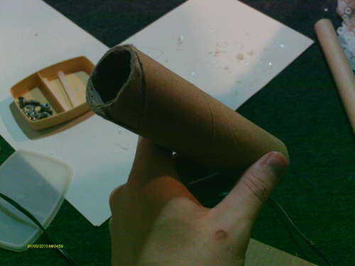 Para la manija izquierda, usé un tubo de cartón muy grueso. Esto era porque habría mucha tensión en el tubo para doblar, y un tubo más grueso sería más adecuado para el trabajo. He cortado con mi cuchillo x-acto y hecho una cola soldada contra la tapa con el interruptor de eje de balancín.
