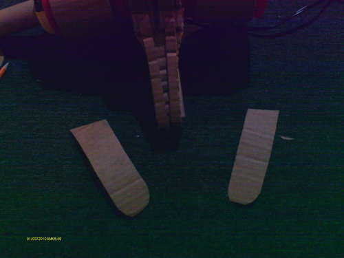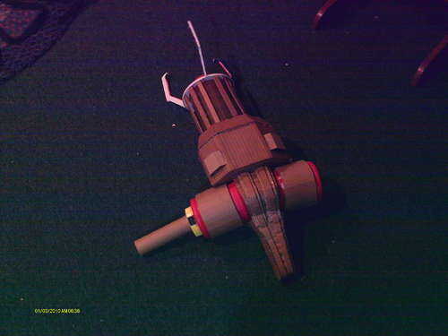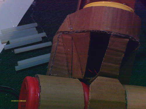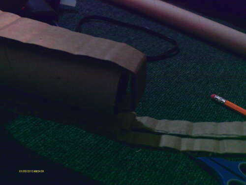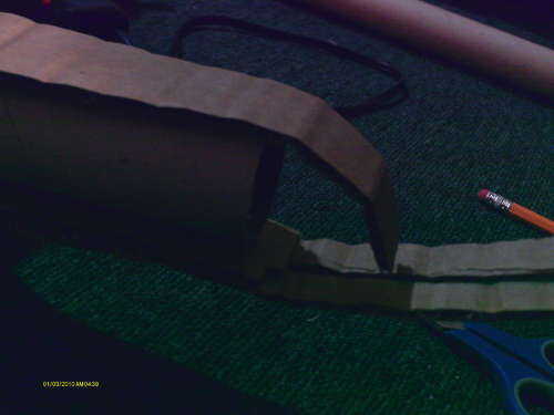 La manija trasera fue construida alrededor de un tubo de cartón para la estructura. He pegado a los extremos de las tiras alrededor del extremo del tubo y cortar los lados de la manija. Después de los lados de la manija trasera estaban pegados en su lugar, era hora de la empuñadura lateral sobre el cilindro izquierdo.