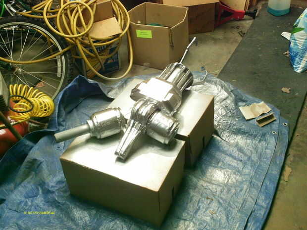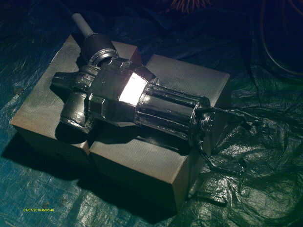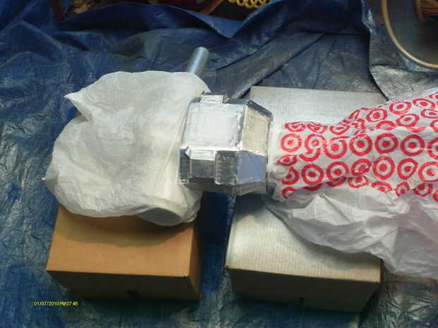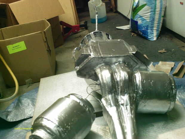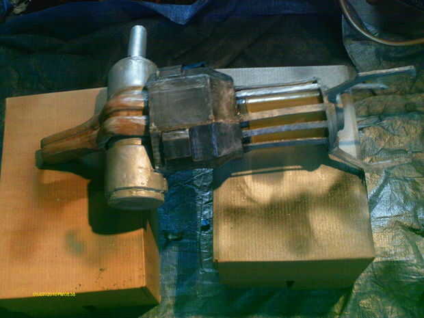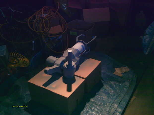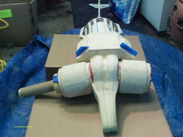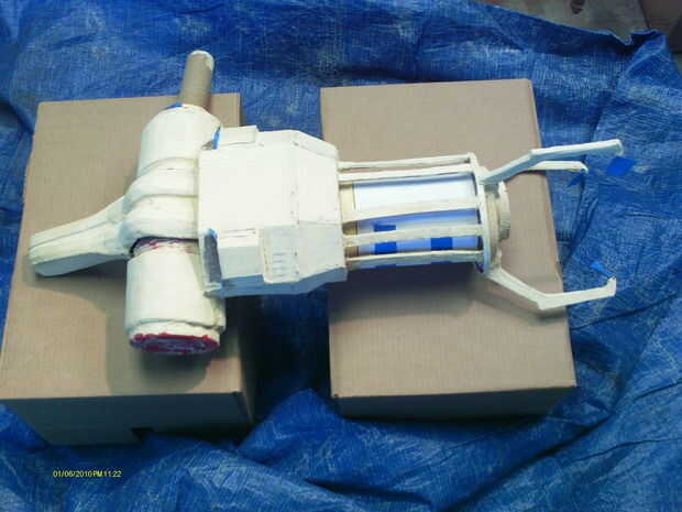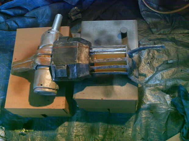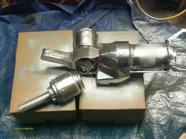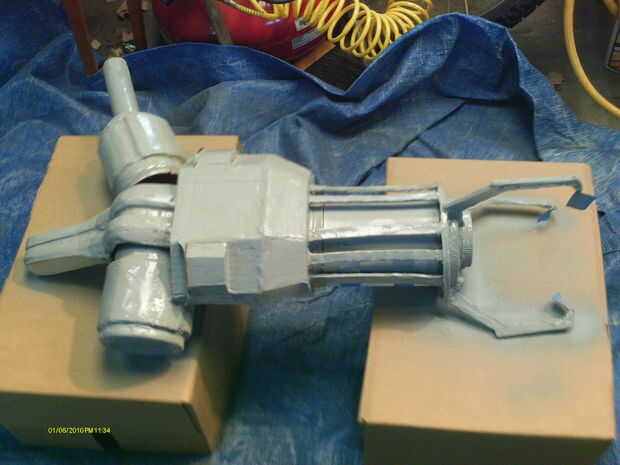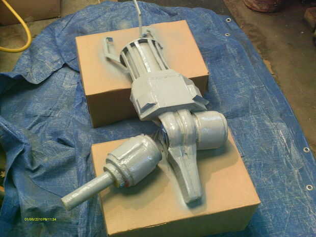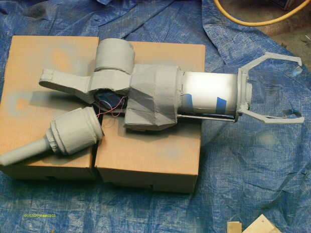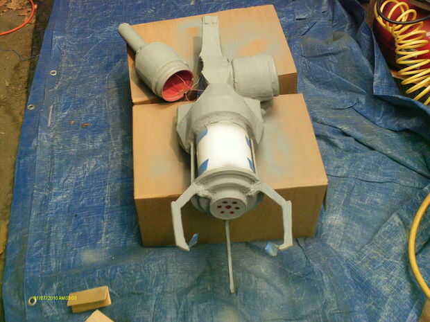 Fui y había comprado plata brillante, gris, negro, marrón y pintura de aerosol de la cartilla. El efecto que estamos tratando de imitar aquí es de distintos tonos de metal. La primera de lo primero. Cubrir algo transparente o importantes (como el eje de balancín interruptor, LED, el frente de las baterías, el emisor y especialmente la cámara de vacío) y colocar una capa de imprimación. Cubrir el reactor entero y el emisor. Dejarlo sentado y seque completamente.