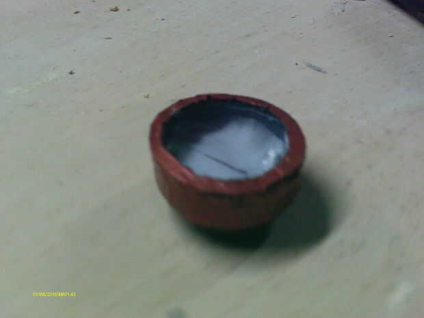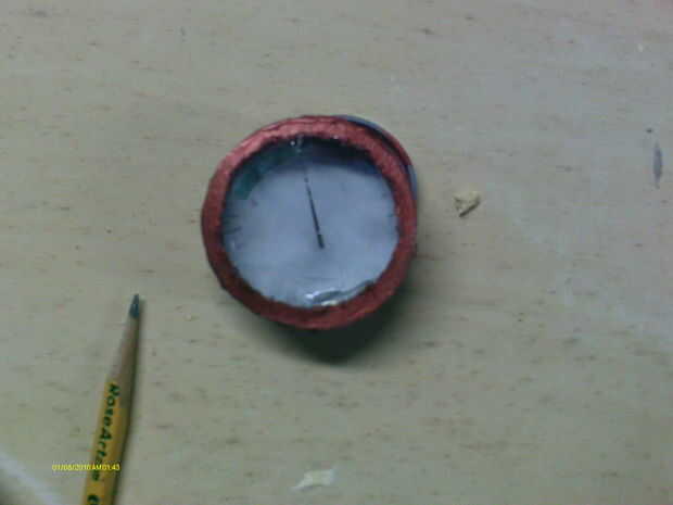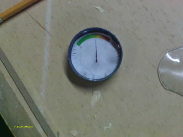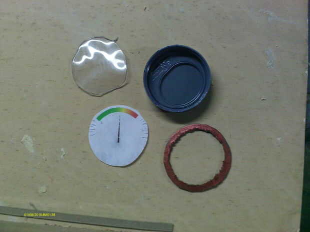 El calibre fue hecho en Gimp, impreso y recortado. La pegué en una tapa que pintados y un anillo de cartulina cortado. Para el plástico claro, necesitaba utilizar una pieza de plexiglás, pero ya que no tengo ninguna, tuve que improvisar y utilizar el plástico de un envase de plástico transparente. Me corte con un cuchillo x-acto, dibujó un círculo, ablandado y aplanado con la pistola de calor (Ten cuidado, querrá curl). Había pegado sobre la tapa y había pegado del anillo de cartulina. Finalmente pegar el conjunto de manómetro al cilindro izquierdo y decorado con unas tiras de cinta del conducto (mina rasgó por la mitad para hacerlos más delgados). También hizo dos barras de cartulina y les pintados cobre. Estos eran caliente pegado detrás de la galga y a la botella de donde colgar en el centro de la costura para que todavía el cilindro izquierdo de ser desmontables.