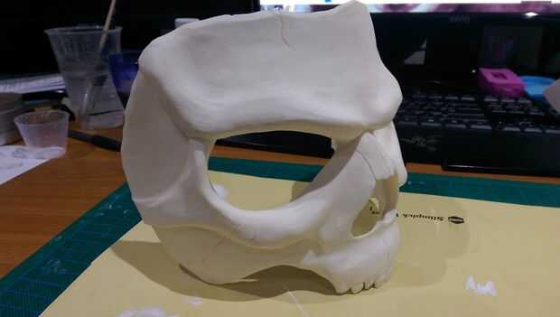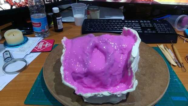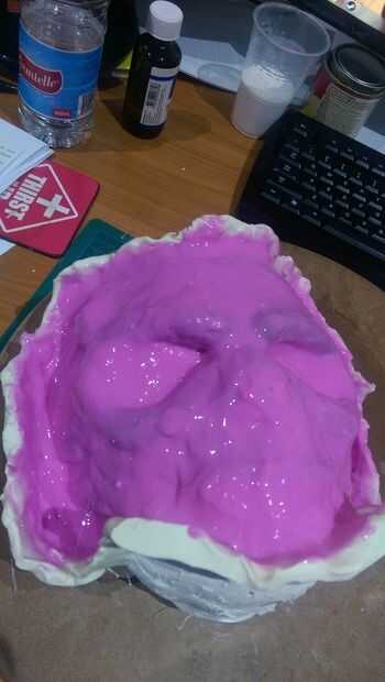 Ahora para que sea usable. La silicona de Pinkysil es una mezcla de dos partes con una relación 1:1 por volumen, así que vierta 2 recipientes iguales (parte A es de color blanca, parte B es un rosa más oscuro) y se mezcla hasta que se convierte luz rosa (unos 20-30 segundos). Este cura bastante rápido así que verterla lentamente sobre la escultura, asegurándose de que vierte desde una altura alta para reducir las burbujas atrapadas en ella. También he construido un pequeño muro alrededor de la base de la máscara para reducir los residuos y el borde de la piel del molde una base gruesa (que ayuda al lanzar) en mayoría de los casos. Hice tandas de Pinkysil en cantidades más pequeñas (unos 100ml por mezcla) y mantenerse haciendo eso hasta que sentí que la piel era lo suficientemente gruesa como para despegar. Si bien esta marca es bastante fuerte y resistente a la rotura, otras marcas como Smooth-On pueden necesitar un agente espesante para abultar encima de la silicona (demasiado cara para conseguir en Australia).