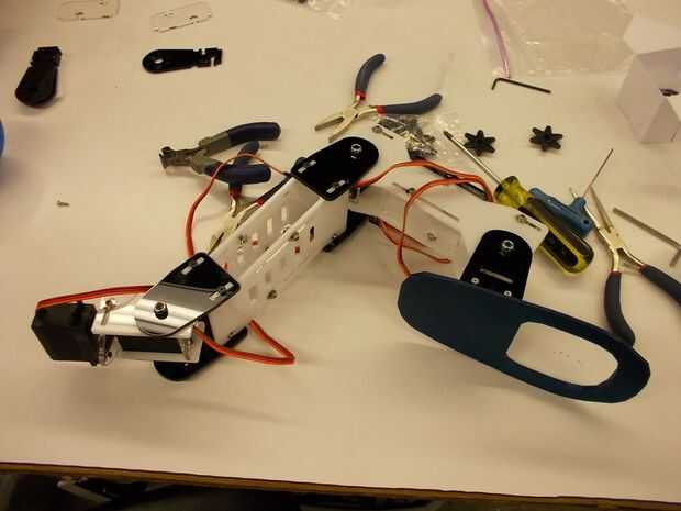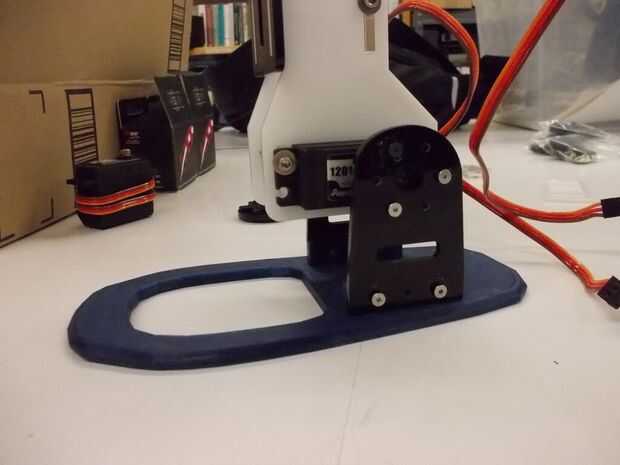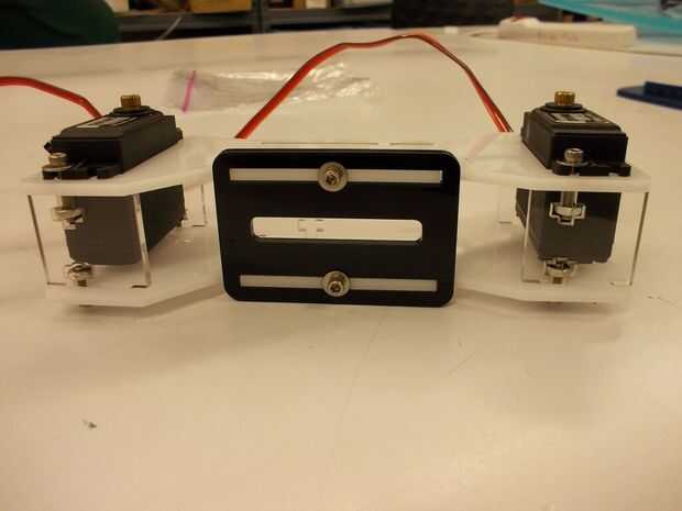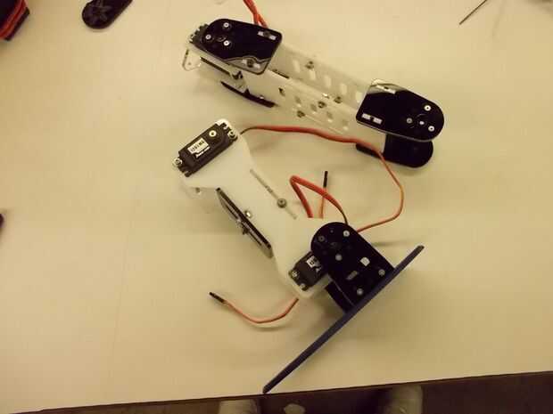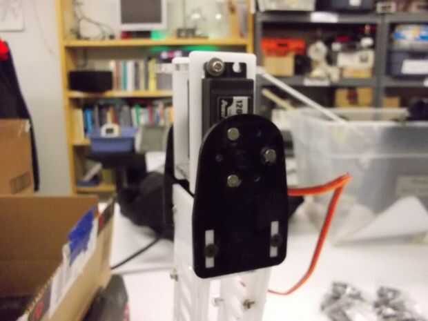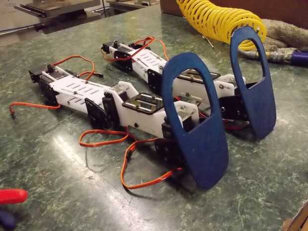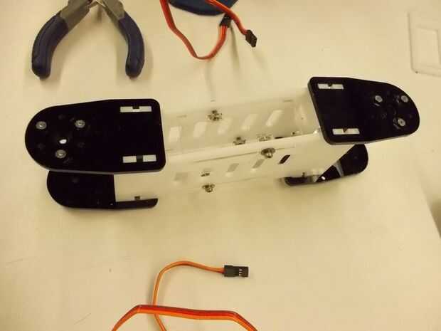 Hay 2 sub-partes principales por la pierna: la pierna y la pierna superior. Una vez más, comience colocando los cuernos servo a sus respectivas piezas de acrílico. Montar la pierna con el pie impreso 3D (2 servos de x). A continación, monta la pierna superior (2 servos de x). Coloque la pierna en la pierna superior. Tenga cuidado para asegurarse de que los servos se orientan correctamente antes de fijar las articulaciones juntos. Tenga en cuenta que debido a que el robot está hecho de acrílico y el hecho de que los servos no son lo suficientemente fuerte, el robot es muy poco probable que sea capaz de caminar.
