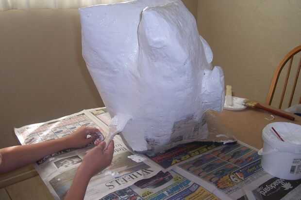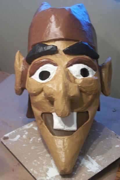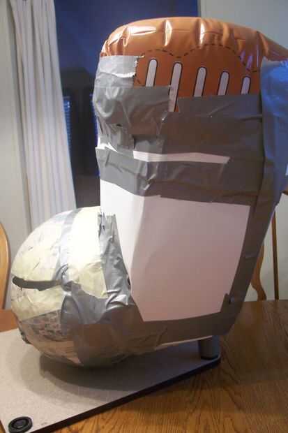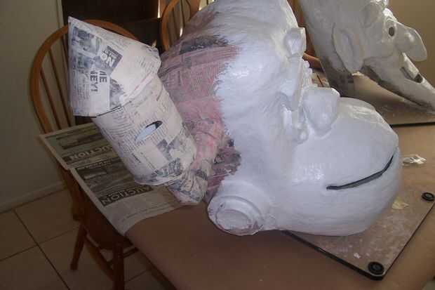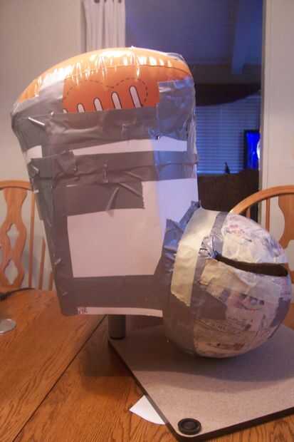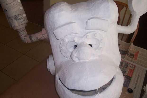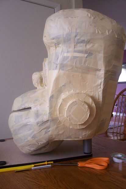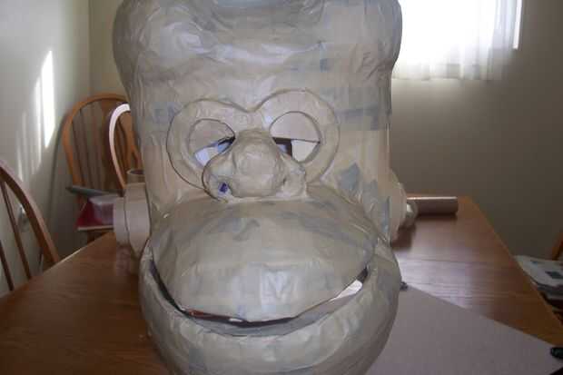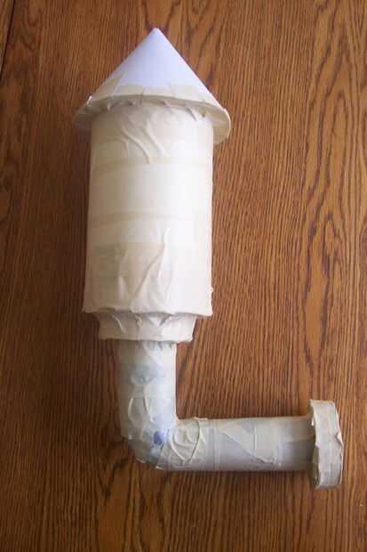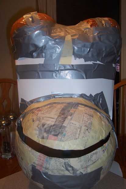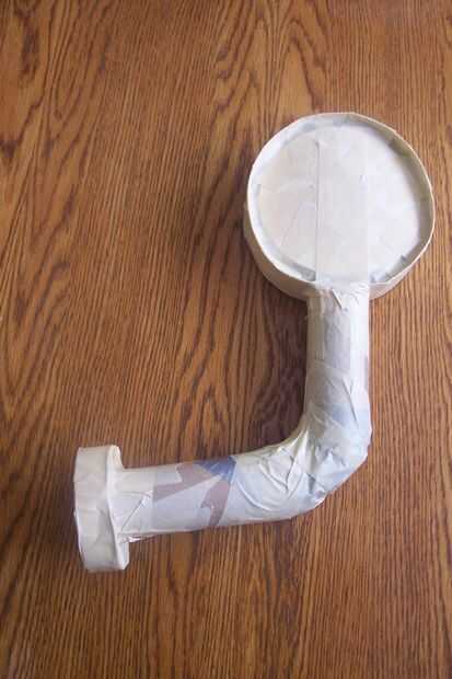 Creé el silbato y medir por separado, utilizando tubos de toalla de papel para los brazos con periódico enrollado hacer las curvas en los tubos. Tuve un momento algo difícil fijación a la cabeza y apoyo durante el proceso de secado. El resto de las características son periódicos arrugados y cinta.