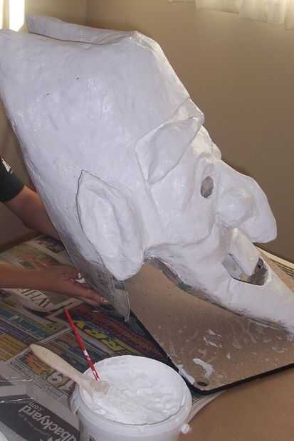 Usé gesso como la capa de imprimación. Funcionó bien. Utilizadas pinturas acrílicas. Mi cabeza de Frank es un poco más brillante en el color porque estaba tratando de coincidir con el cuerpo de cada traje (que por cierto fue comprado) a la máscara. Acabada con un barniz satinado.