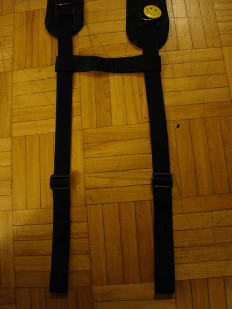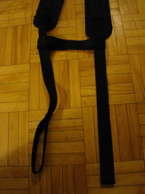 3 - el resto es bastante sencillo. Una longitud de correa se teje a través de la almohadilla de cada Liga. Se cose el extremo posterior para crear un bucle a través del cual pasa un cinturón. El extremo delantero está cosido a una cosita de tal manera para permitir el lazo delantero ajustar de plástico. Correa A"Cruz" colocada en ambos extremos se asegura con velcro a poca distancia de las almohadillas de la liga. Estos evitará que los tirantes de deslizamiento sobre el hombro y cae una vez que se unen las hombreras.