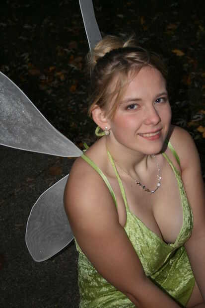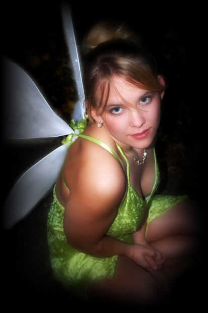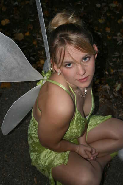 Para Halloween 2009 mi novia y yo fuimos como Peter Pan y Tinker Bell. Hicimos nuestros trajes sin patrones. No sé qué material que utilizamos para vestido y zapatos pero era la clase derecha verde, elástica y miró de frondoso... Las alas fueron hechas por estiramiento de nylon blanco sobre percha Marcos y pintura con brillo. Las alas se unen a sus hombros con la cinta verde. Las bolas en sus zapatos eran una especie de boa de plumas lo ató en el puño de un mono y cosida a los pies.