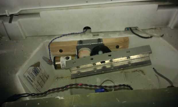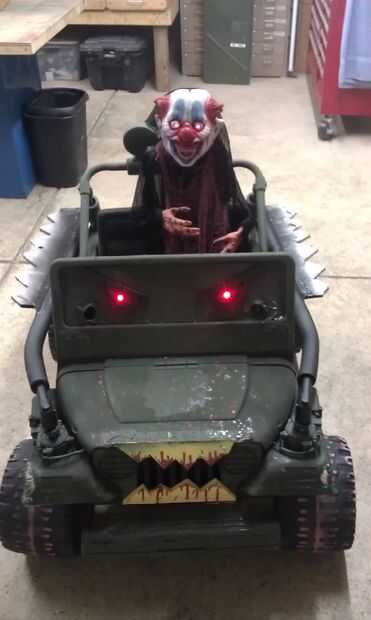 Los dientes chomping de campana eran realmente fáciles de hacer. Puse una pequeña bisagra de la campana y poner un motor lento de vuelta (30 RPM) dentro de la campana con un pedazo corto canal de aluminio atornillado al eje de salida del motor. Alambré el motor a través del interruptor del relé y al cerrar el relé del corriente el motor arranca y el canal de aluminio golpea la campana empujándolo hacia arriba, rota, la campana cae hacia abajo y al mismo tiempo que el motor ha hecho otra revolución y levanta la campana detrás encima otra vez. Los dientes son aislamiento de la espuma de Home Depot y sujeta con alguna cinta real. Con un poco de pintura empiezan a parecerse a los dientes.