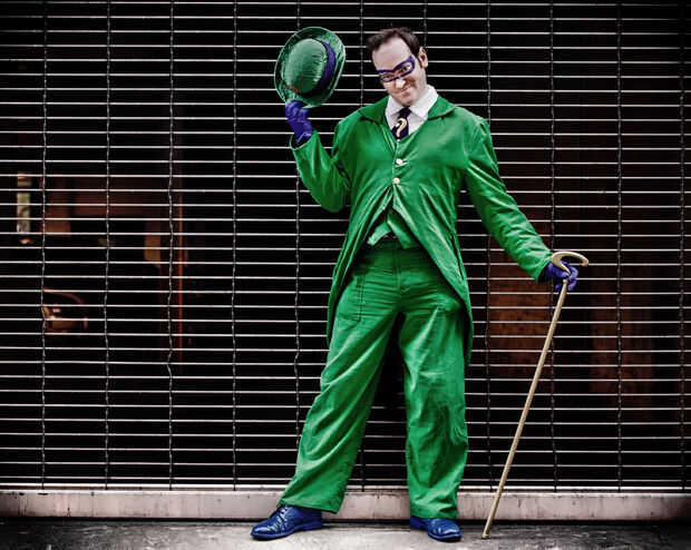 El traje de acertijo era un traje de tres piezas hecho de pana verde y forrado con un material de sedoso púrpura. Utiliza patrones de simplicidad para crearlo, pero modificado para añadir colas. Los guantes son un tramo de nadar punto, muy difíciles de trabajar con pero hizo buenos guantes. Somos tienda compró un sombrero de boulder que luego cubrí con traje verde Satén y la tela cruzada del mismo como el lazo para hacer la banda púrpura. Los signos de interrogación se hicieron utilizando una plantilla que hice con mi Cricut. Que ellos bordados alrededor de ellas para acabar con. Mi padre hizo el signo de interrogación bastón de roble de enrutamiento a la forma correcta. Le di el acabado en oro.