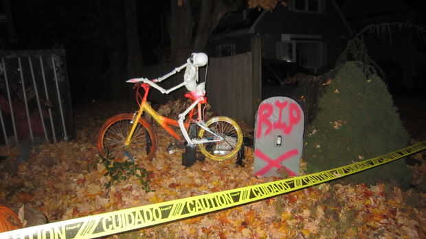 • Esqueleto manejando una bicicleta, un motor de puerta de garaje hace girar la rueda trasera y hace que mover las piernas