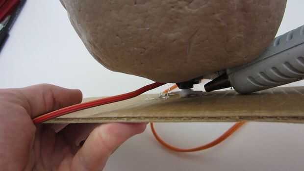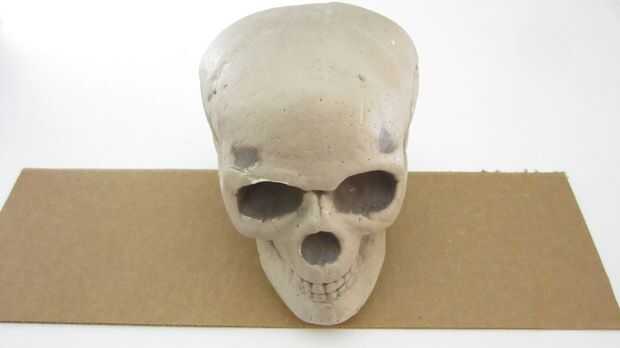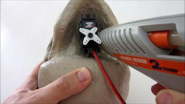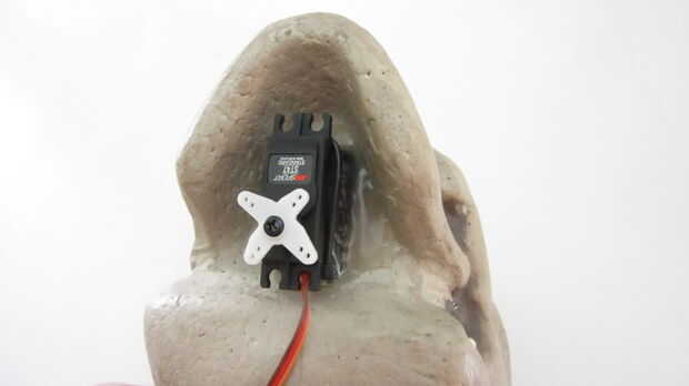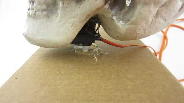 El cráneo que estoy utilizando tiene un área plana empotrado en la parte inferior detrás de la mandíbula. Esto hace un lugar conveniente para montar el cuerpo del servo. Para fijar el servo a la calavera me aplica una cantidad generosa de pegamento caliente en la parte inferior del servo y presiona los dos juntos durante varios minutos. Luego apliqué más pegamento caliente alrededor de los bordes.