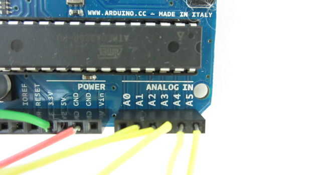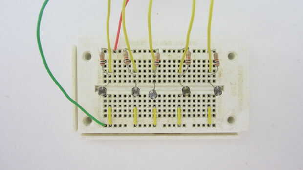 Primero reuní los sensores en un protoboard. Corrí un cable puente desde el pin de 5V de Arduino a uno de los carriles de la energía en el protoboard. Entonces corrí un cable puente del pin GND de Arduino al otro larguero de energía. Luego he añadido los fotorresistores y 10 resistencias de k entre los carriles de la energía como se muestra en la foto de arriba. Luego he añadido un cable puente de los pernos de centro de cada sensor a los pines de entrada analógicos 1-5 en el Arduino.