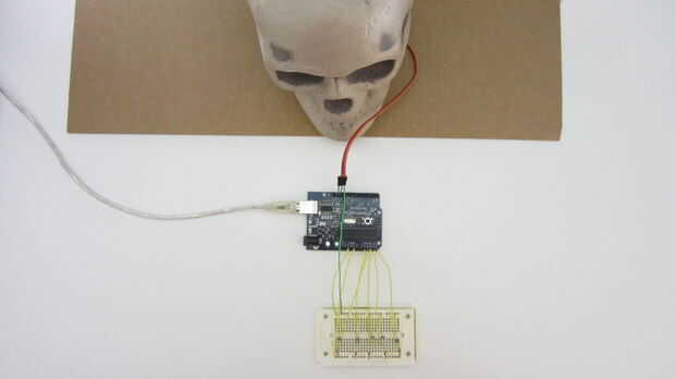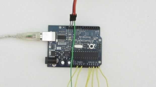 Ahora necesitas conectar el servo con Arduino. El servo tiene tres cables. El cable de tierra es normalmente negro o marrón. Esto se debe conectar a uno de los pines GND en el Arduino. El cable de señal suele ser amarillo, naranja o blanco. Esto debe conectarse a uno de los pines digitales en el Arduino. El cable positivo es típicamente rojo. Esto debe ser conectado al pin de 5V de Arduino. Lamentablemente hay un único pin de 5V de Arduino y que ya está siendo utilizado para alimentar los sensores de luz. Tan debe conectar este cable en el riel de alimentación positiva positiva en el protoboard.