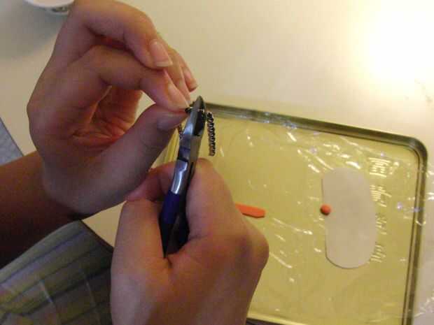 Usando las mismas medidas como el último paso, cortar la cadena de diamantes de imitación para acoplarse a la pieza de sugru han cortado y aplanado. Empuje la cadena hacia abajo hasta que esté segura.
