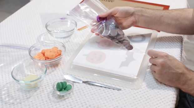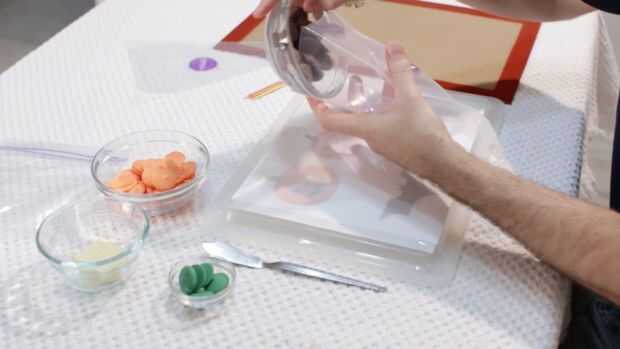 A continuación queremos decidir qué color comenzar con. Voy a hacer primero la parte de chocolate con leche o todas las partes oscuras de mi plantilla. Con estos derretimientos de caramelo, puedo ponerlos en la bolsa de caramelos y luego poner esa cosa entera en el microondas y fundir el chocolate. Microondas en alto por 30 segundos luego apriete la bolsa grande, masajeando el caramelo se derrite, luego otros 20 segundos más o menos y el chocolate debe estar listo. Luego corte la punta de la bolsa de dulces. Asegúrese de que cortar bastante cerca de la punta, de manera que el agujero será pequeño.
