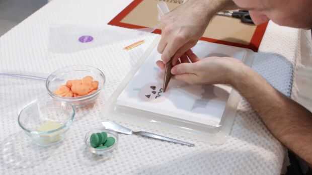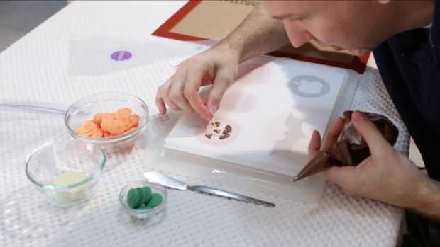 Ahora empezamos a rellenar la plantilla con chocolate. Clase de como colorear con un lápiz de cera. Asegúrese de mantenerse dentro de las líneas! :) Cuando haya terminado, utilice un palillo de dientes para suavizar un poco la parte superior del chocolate.